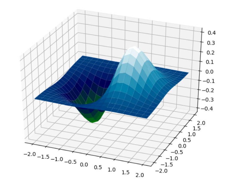 我们将演示如何借助于ufunc的广播运算计算下述二元函数的在一个xy平面上的值并将其绘制成3D曲面。其中,x和y的取值范围均为[-2,+2]。