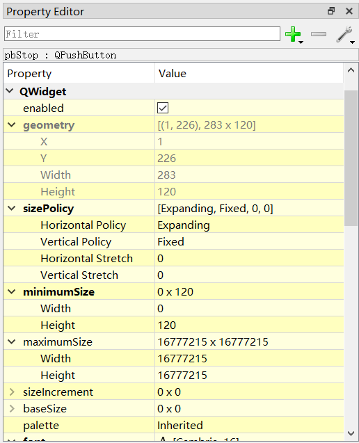 多数情况下,我们都会把组件放置在布局容器中。sizePolicy-尺寸策略将参与决定组件的最终尺寸。下图中,STOP按钮的Horizontal Policy为Expanding,这意味着,按钮将试图横向填满布局。STOP按钮的Vertical Policy则为Fixed,这意味着按钮的高度将为固定值,此处取了minimumSize中的Height,即120。后面的minimum Size和maximum Size则设置了组件的最大和最小尺寸。如果读者希望组件的大小是固定值,可以尝试把minimum和maximum Size设为相等的固定值。