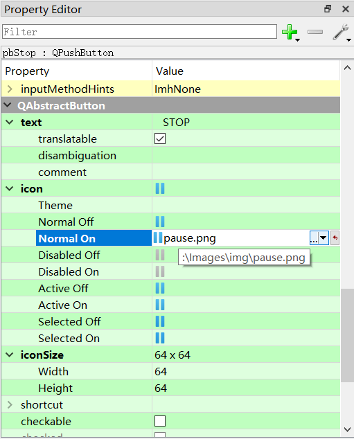 text属性设置了按钮上的显示文字;iconSize设置图标的长宽;在Normal On那里点有省略号的小按钮,可以打开如下界面: